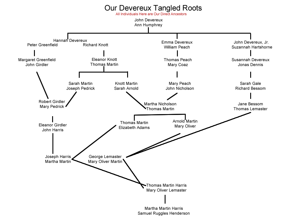 Martha Martin Harris sits at the base of the Marblehead branch of this family tree. All four of her grandparents were descended from John and Ann Devereux, who were among the very first settlers of Marblehead. Three of their children were our direct ancestors: Hannah, Emme, and John.