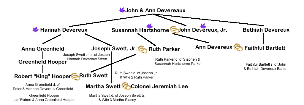 Hannah Devereux abt. 1645; m . 1) Peter Greenfield (abt. 1635 in England and probate 26 Sep 1672), three children: Anna, Margaret, and Hannah Greenfield; 2) Richard Knott (b. abt. 1635 in Salem and d. Jun 1684 in Marblehead), four children: Elizabeth, Richard, Hannah/Mary, and Eleanor Knott; 3) Joseph Swett (b. 28 Nov 1657 in Newbury and d. after 1710 in Marblehead), one child: Joseph Swett., Jr.; d. after 1710 | |||||