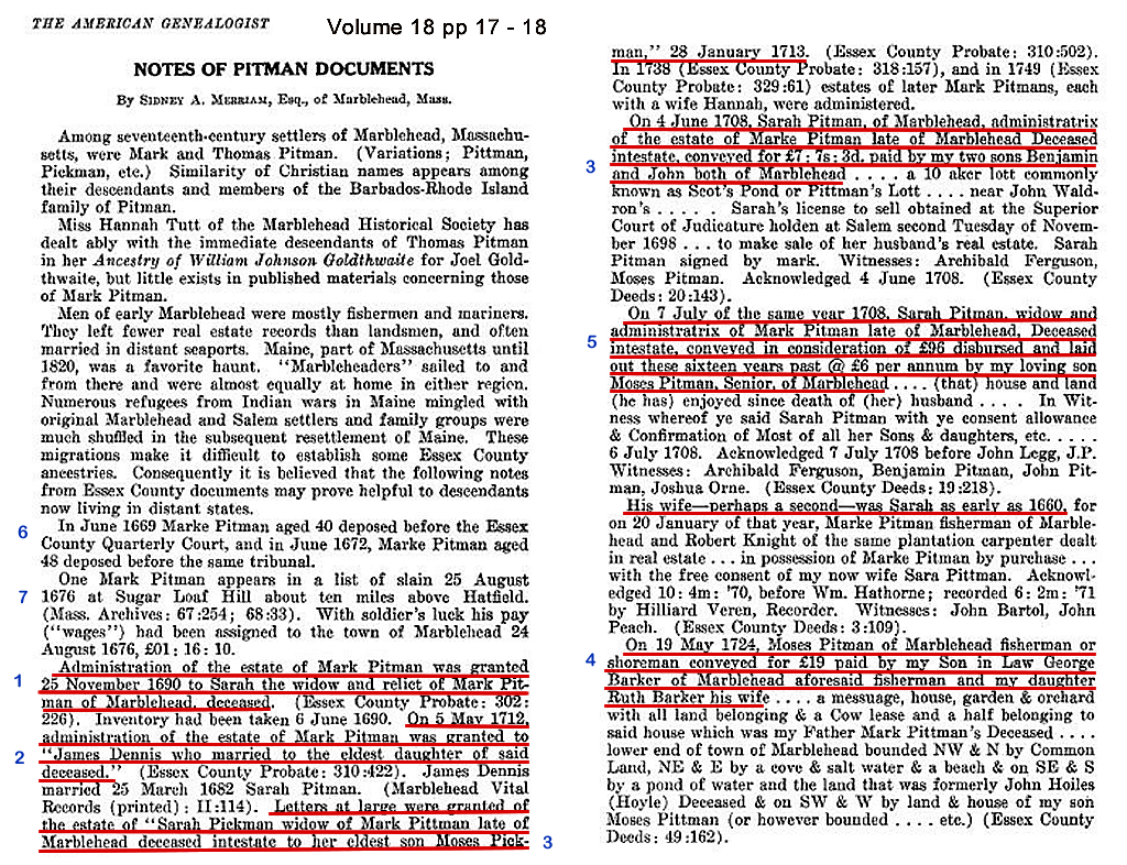 Reasons for uncertainty: Kyle Zelner wrote in his excellent book Rabble in Arms: Massachusetts Towns and Militiamen During King Philip's War that Mark Pitman was married to Mary Shapligh. I have used the New England Marriages Prior to 1700 source that records his marriage to Sarah Shapleigh with a question mark after her name. (Events from this time were often reconstructed long after the fact and sometimes have such conflicts). That Sarah's mother was named Sarah is clear in the probate papers. This same record states that he lived from 1620 to 1690. That 1690 date could have come from the date of his probate administration, which generally was soon after death. Another source says he was born in 1622, Zelner says he was born in 1625, and the depositions would give him birth dates of 1629 and 1624. Inconsistencies like this from that time period are not unusual. A well-researched family headed by Alexander Shapleigh had fled to Massachusetts from Maine, but I could find no Sarah Shapleigh married to a Mark Pitman among them. That doesn't rule out her name as being Shapleigh, but the question mark demands authentication. In 1708, Moses Pitman, the oldest son of Mark, was compensed for 16 years of annual payments to his widowed mother. These payments would have started in about 1692 if we subtract 16 from 1708. Did he start this annual support soon after his father's death? If so, his father died close to the 1690 reported in the marriage record. Is it possible his wife, Sarah, was supported by Massachusetts in between 1675 and 1692?