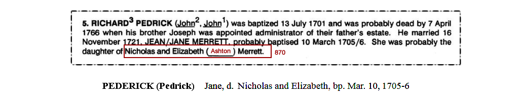 Nathaniel Pedrick bp. 2 Mar 1735; m. 16 Jan 1759 Mary Tucker (b. 8 May 1739, d. 1770); one child: Mary Pedrick; probate 18 Oct 1764 | ||||||