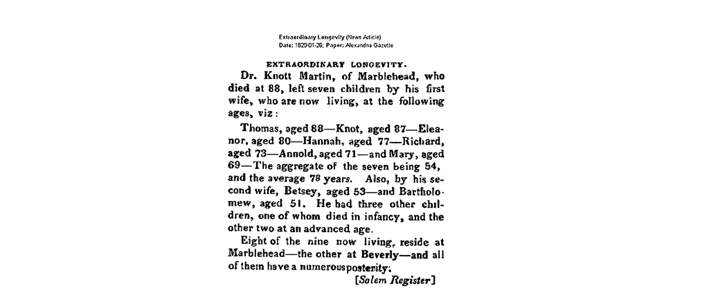Captain Knott Martin, Jr. b. 31 Dec 1734 in Marblehead, m. 1) 27 Dec 1756 in Marblehead, Elizabeth Bowen (b. 27 Feb 1733 and d. 28 Jul 1809 in Marblehead); nine children: Sarah, Thomas, Elizabeth, Nathan, Mary, Knott, Ambrose, Nancy, and Hannah Martin; 2) Mercy Brooks (20 May 1750 and d. 21 Apr 1832 in Marblehead); d. 7 Jul 1822 in Marblehead, age 88 | ||||||