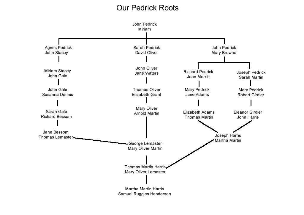 John Pedrick bp. 15 Dec 1689; m. 2 Oct 1712 Miriam Hendley (b. 22 May 1690, d.. aft. 1736); three children: Mary, Miriam, and John Pedrick | ||||||