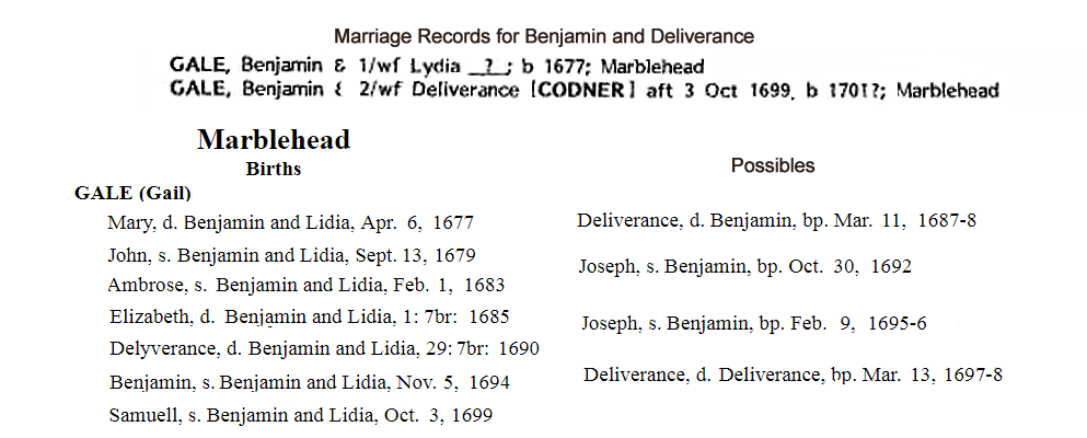 Marriage | abt. 1676 | Benjamin Gale to Deliverance Codner in Marblehead | ||||