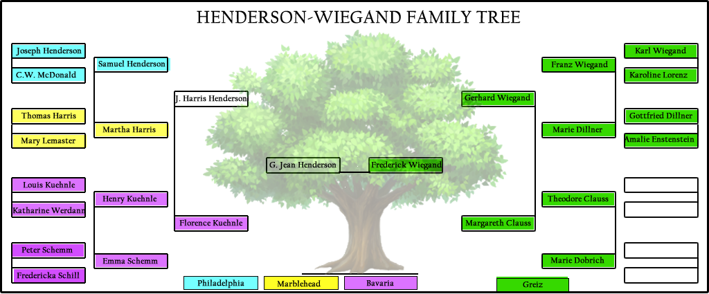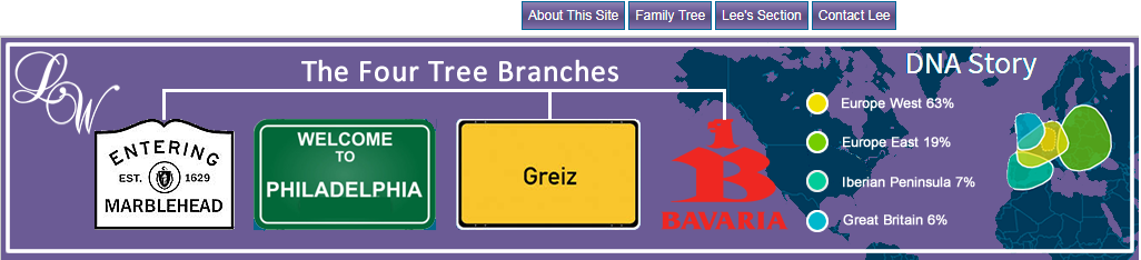 Each "found" generation of a family tree results in a doubling of the number of family groups (two parents, 2 parents. 4 grandparents, 8 grandparents, and so on). The goal of the research for the Philadelphia, Marblehead, and Bavaria Branches of this Tree was to trace the ancestry to the point of immigration. (The Greiz Branch went back several generations in Germany). Some of the ancestors in this Tree arrived in America as early as 1630, so the entire Tree has a large number of Family Groups.The division into branches places the focus on what the groups in each branch have in common - either the location where they settled or the location from which they came.