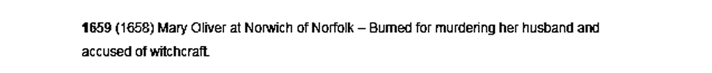 "Death: Mary Leman Oliver, was still in Massachusetts 'til 1649, confessed to witchcraft, shipped back to England in 1649, was placed in a cage outside Norwich Guild Hall, burned at the stake as witch in 1659 at Norwich."